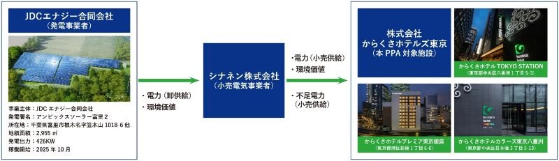 シナネンホールディングス株式会社の子会社で、エネルギーソリューションを提供するシナネン株式会社(東京都品川区、代表取締役社長:小松良則)は、オフサイトフィジカルコーポレートPPA※1(以下、本PPA)のスキームを活用し、日本国土開発株式会社(東京都港区、代表取締役社長:林伊佐雄)の子会社であるJDCエナジー合同会社が新設した太陽光発電所から調達した再生可能エネルギー由来の「生グリーン電力」※2を、2025年10月から株式会社ザイマックスグループの子会社である株式会社からくさホテルズ東京(東京都港区、代表取締役社長:佐藤亮祐)がホテル運営を行う「からくさホテルプレミア東京銀座」「からくさホテルTOKYO STATION」「からくさホテルカラーズ東京八重洲」の3ホテルへ供給を開始することをお知らせします。