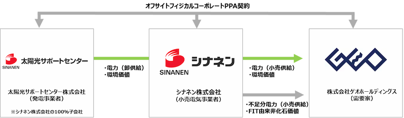 エネルギー・住まい・暮らしの総合サービス事業を提供するシナネンホールディングス株式会社(本社:東京都港区、代表取締役社長:山﨑 正毅)の子会社で、エネルギーソリューションを提供するシナネン株式会社(本社:東京都港区、代表取締役:渡邉 雅夫)は、オフサイトフィジカルコーポレート PPA※1(以下、本PPA)の仕組みを活用し、シナネンが新設した太陽光発電所から調達する再生可能エネルギー由来の生グリーン電力※2を、2024年5月1日から株式会社ゲオホールディングス(本社:愛知県名古屋市、代表取締役社長執行役員:遠藤 結蔵)の4店舗(「ゲオ春日井インター店」「セカンドストリート春日井インター店」「セカンドストリート高針原店」「セカンドストリート美濃加茂店」)へ供給することに合意いたしました。