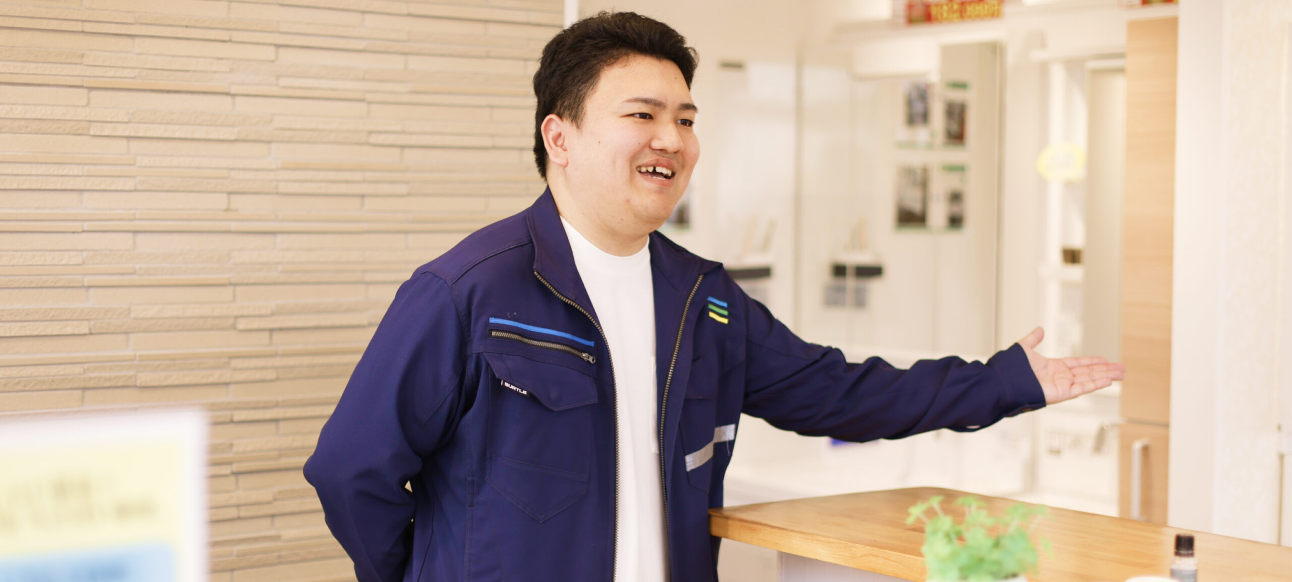 ショールームでのリフォーム営業から工事の現場監督、アフターフォローまで一気通貫で担当しています。お客様から相談いただく住宅のお困りごとの解決に向けたプランをご提案。ご自宅へ伺い、採寸など現地調査を行い、お見積もりを作成します。契約後は部材の手配はもちろん、大工や水道、電気など複数の専門業者と調整し、工事全体の進行を管理。職人同士の橋渡し役となり、細かな配慮でスムーズな施工につなげています。