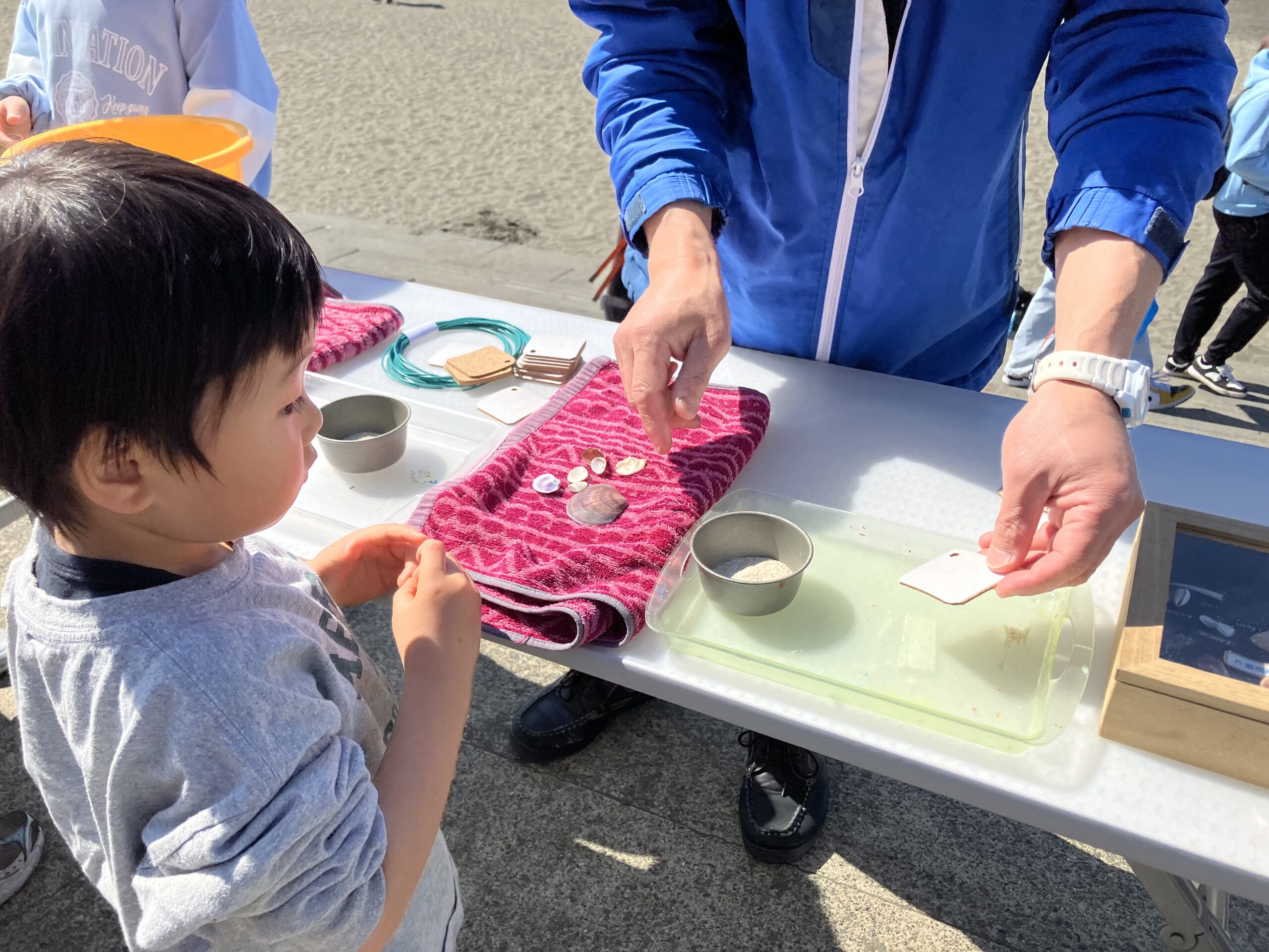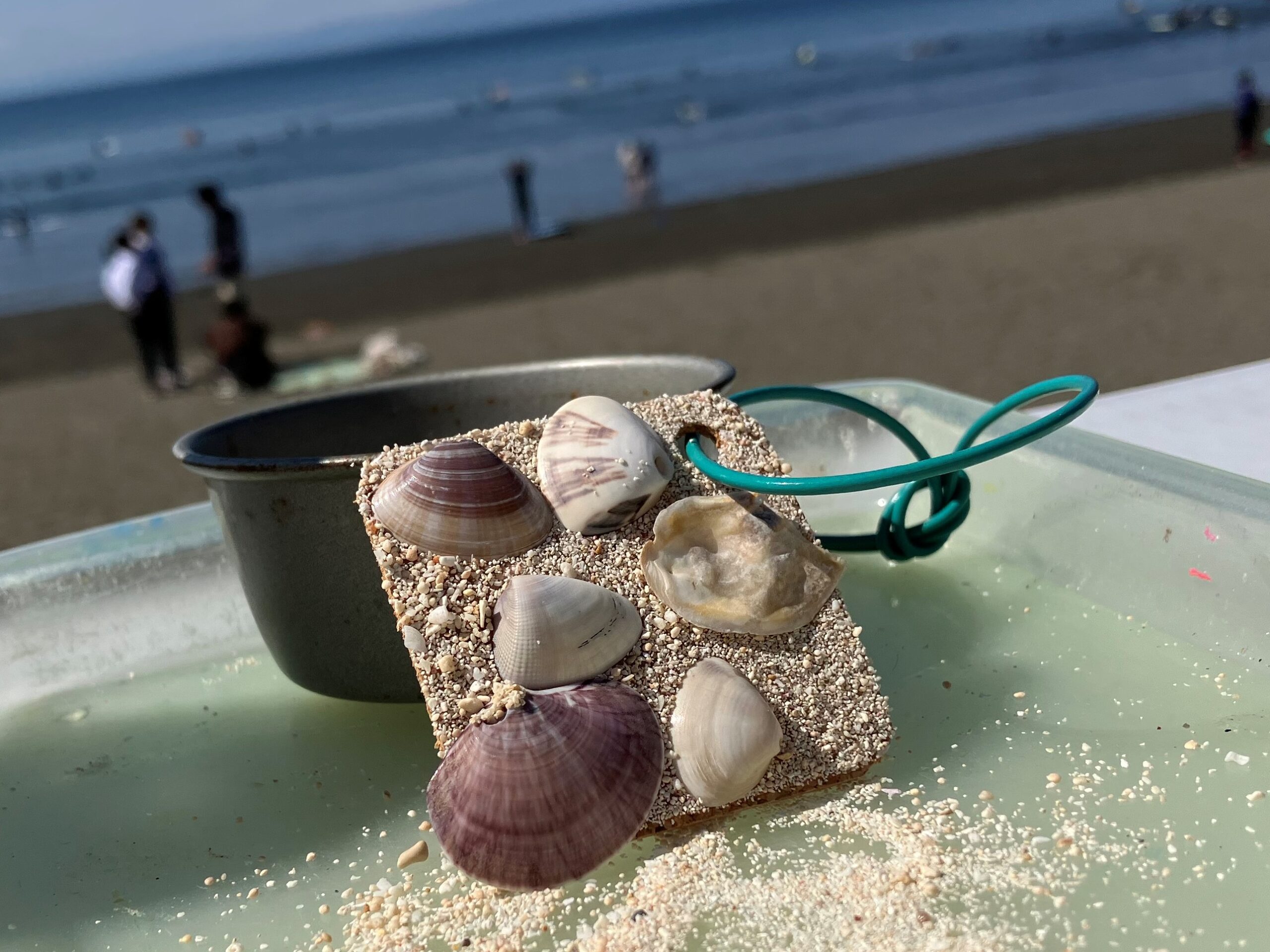 拾い集めた貝殻を使い、オリジナルのキーホルダーづくりに挑戦。子どもたちはお気に入りの貝殻を選び、きれいに洗って作品づくりに集中していました。色や形もさまざまな個性あふれるキーホルダーが完成し、とてもかわいらしい仕上がりとなりました。