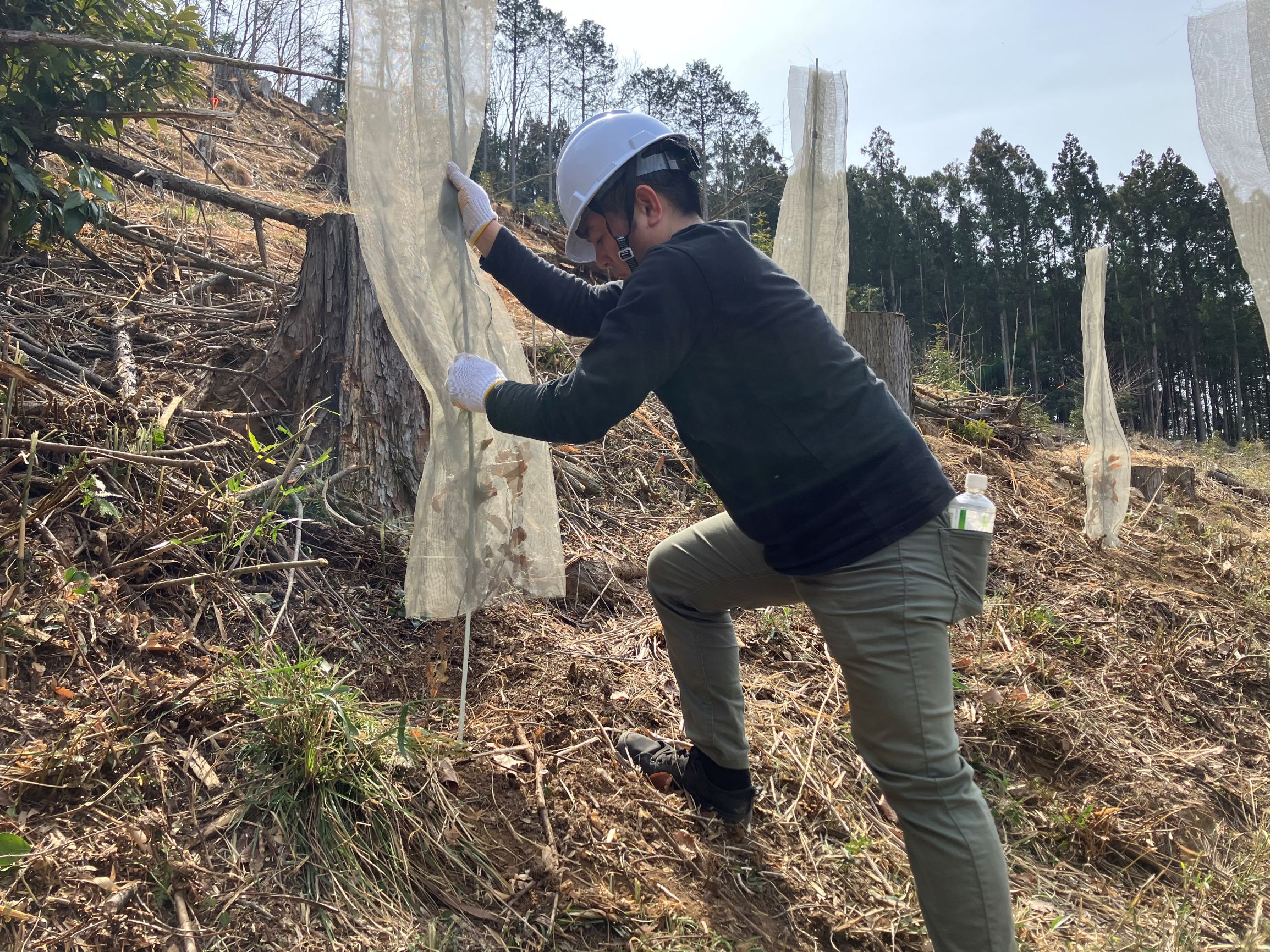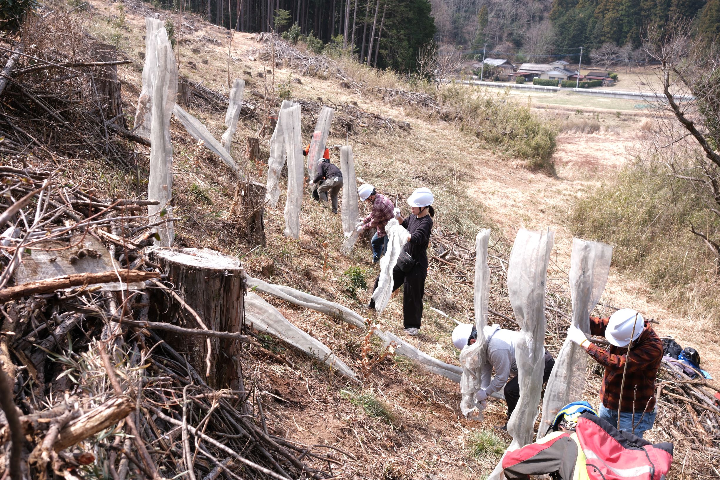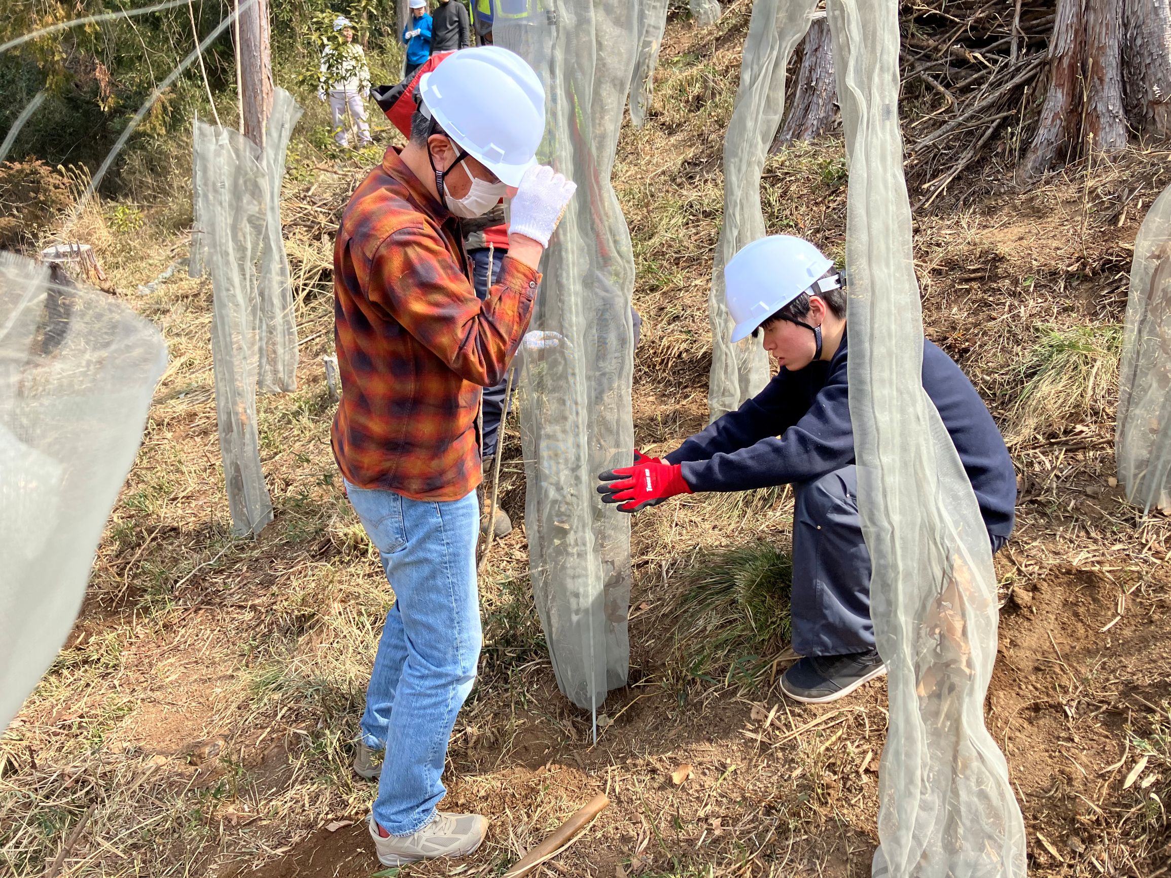 すべて植え終えた後は、獣害や強風から苗木を守るための防護ネットを1本ずつ設置しました。ネットを苗木に被せながら、一体型になったポールを地面に深く差して、杭で地面に固定します。防護ネットは約5年間取り付けたままにして、成長したら外します。