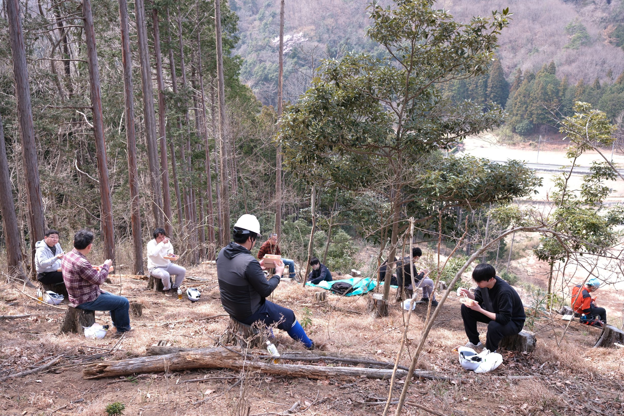 約1時間半の作業を終え、山頂で昼食をとりながら参加者同士で感想を共有しました。青葉組の職人さんは1日で約200本の苗木を植えると聞き、一同驚きの声。
