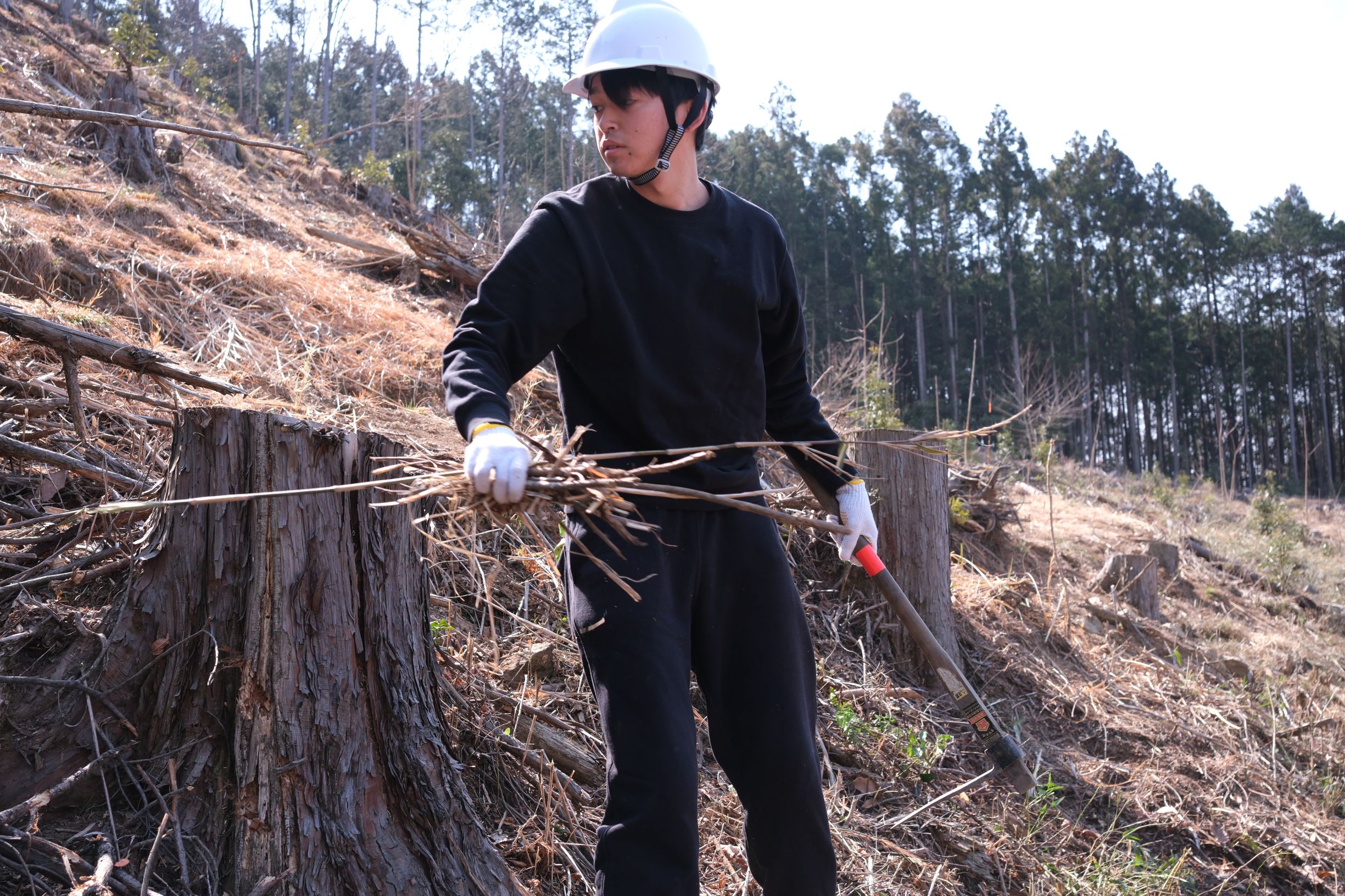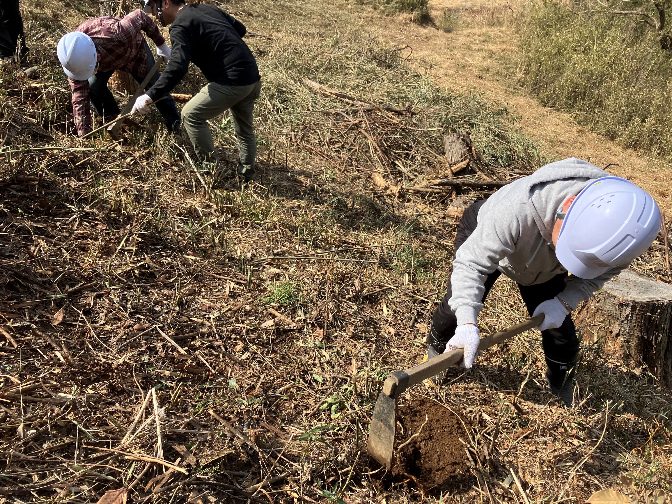 作業は、まず枝や根を取り除いて地面を整える「地ごしらえ」から始まりました。急斜面での作業は重労働で、初めての参加者からは「こんなに大変だとは思わなかった」との声も。