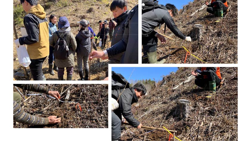 さらに、茂木町の土壌は水源の保水機能に優れており、水源涵養(森林が水を蓄え、ゆっくり流す力)や流出量の調整を測定するのに適した地域であること、また、森林は適切な手入れによって植生が大きく変化し、その変化が災害リスクの低減や生物多様性の向上につながることの説明がありました。
