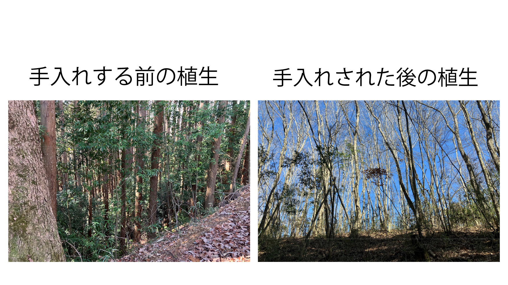 実際の現地では、登山道を境に、手入れが進んでいないエリア(下側)と手入れが行き届いているエリア(上側)が広がっており、写真からもその違いが一目で分かります。