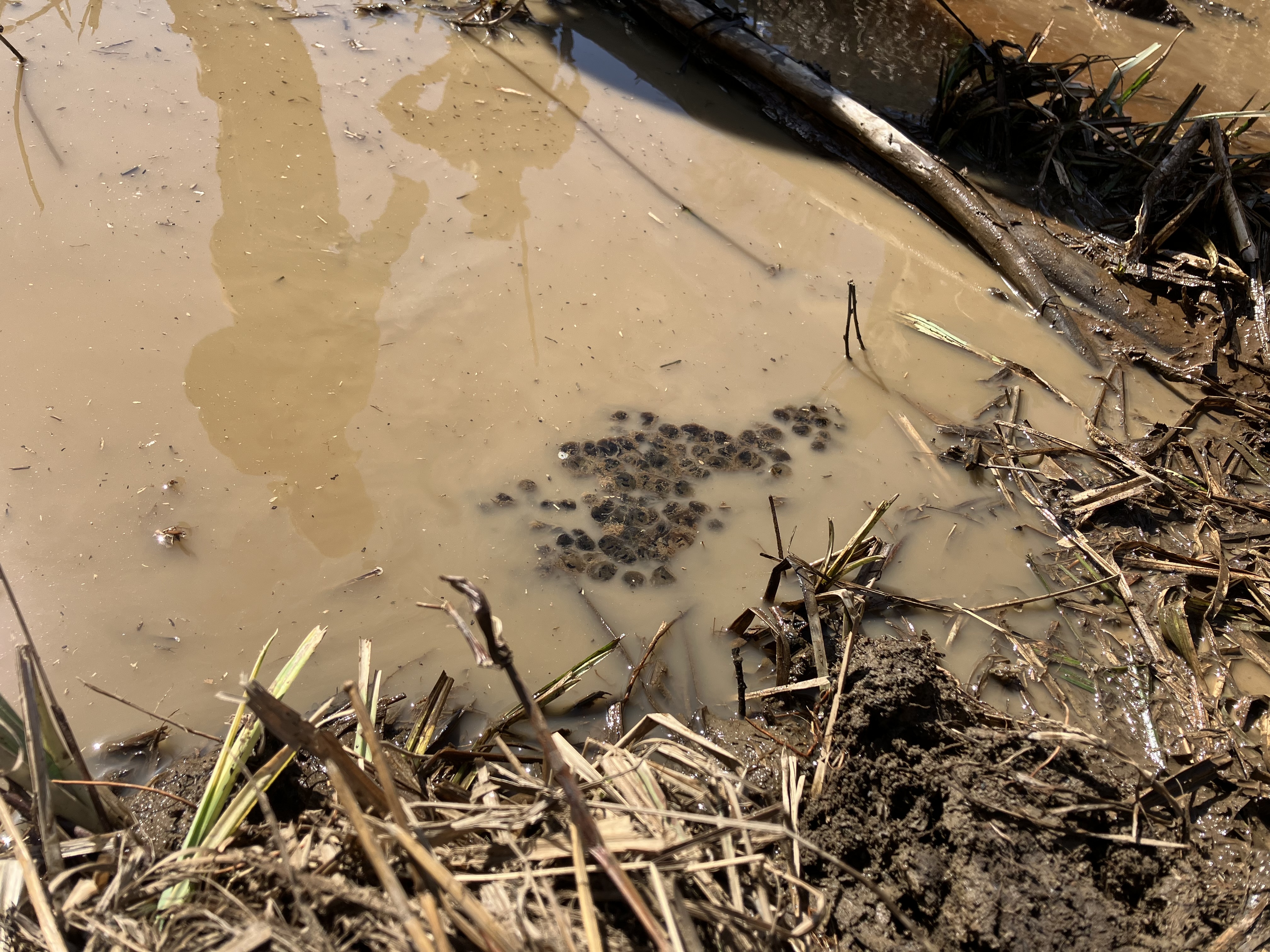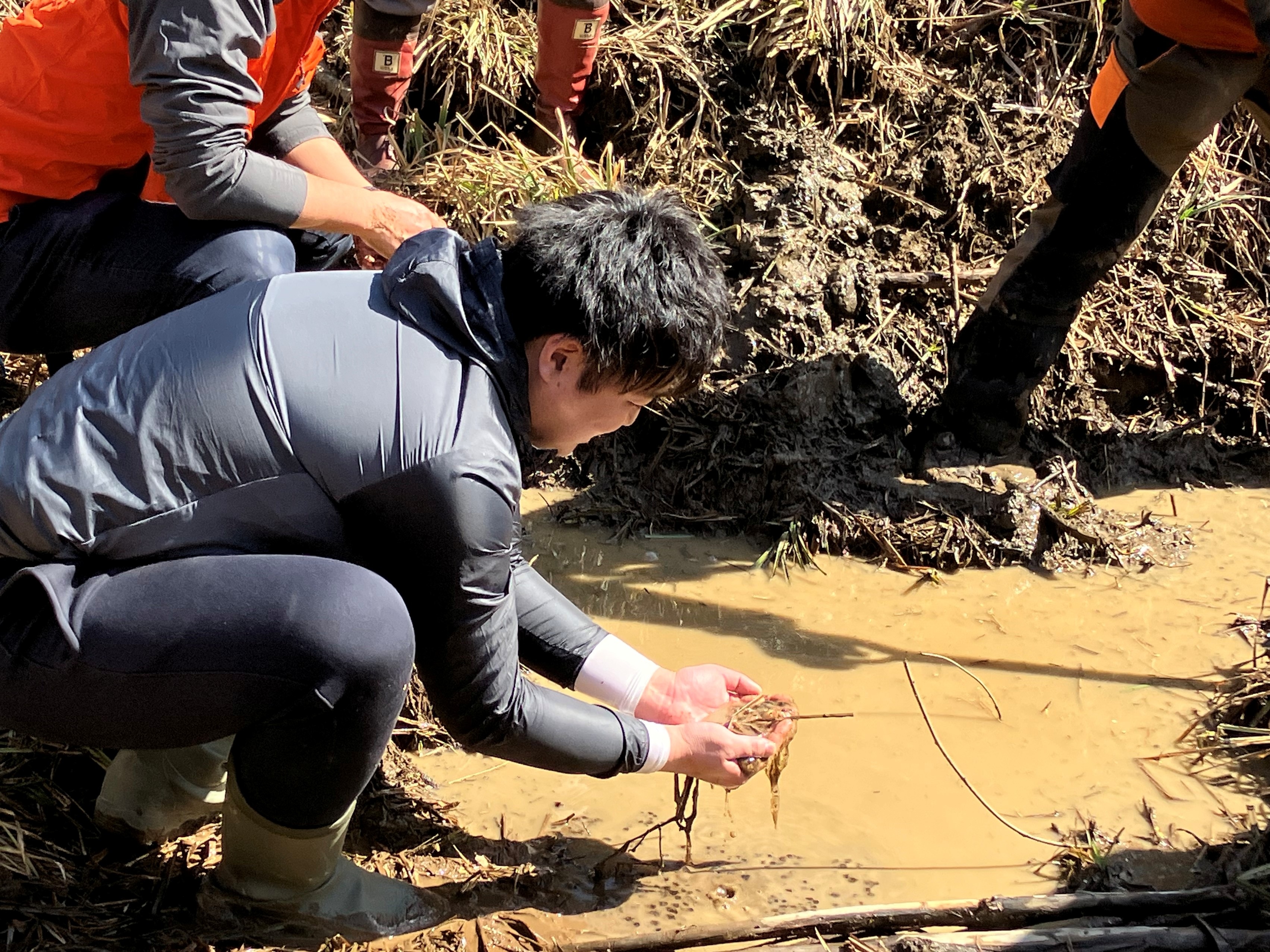 2月初めに私たちが造成した水辺を確認すると、なんとアカガエルの卵を発見!造成からわずか1ヶ月で生き物が応えてくれたことに、私たちも青葉組の人も驚きました。長期的な植林と並行して、即効性のある水辺造成にも意義があると実感しました。