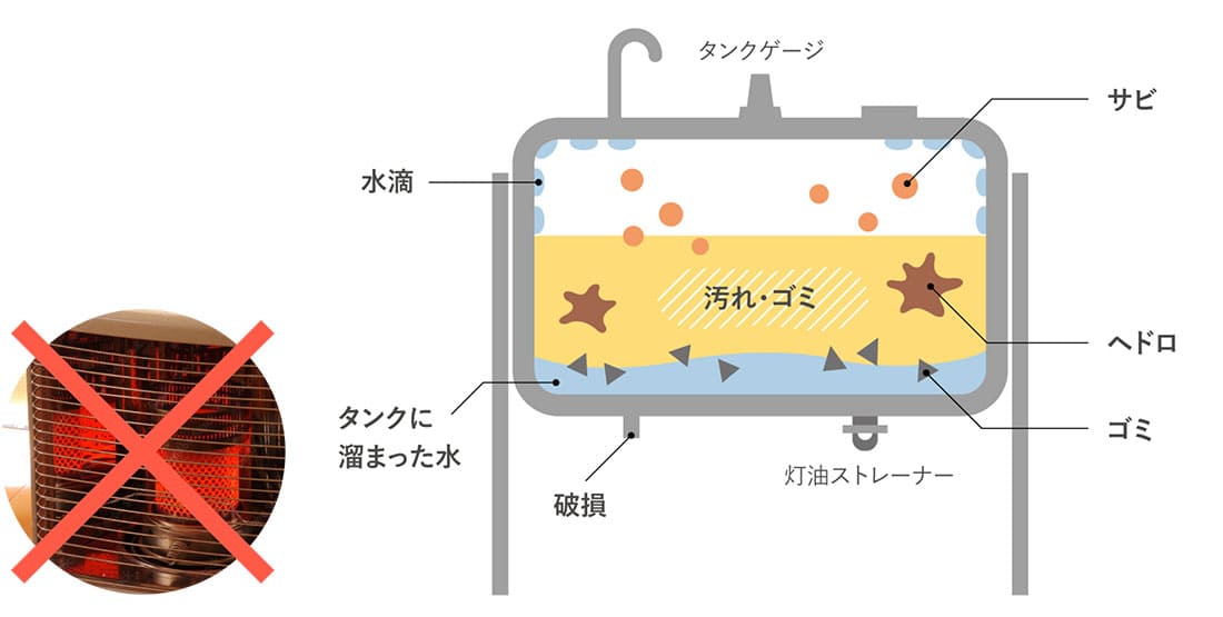 汚れた灯油やごみが灯油機器に入ってしまうと、故障や燃料不良などのトラブルが起きやすくなります。大きな出費につながる前に2~3年に一度、定期的なホームタンクのメンテナンスをおすすめしています。