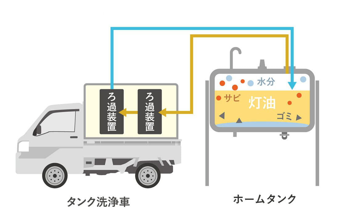 作業当日は、タンク内に灯油が1/4以上入っている状態にしてください。灯油を洗浄機械に通して洗浄するため微量が機械に付着しますが、灯油のほとんどは作業後もそのままお使いいただけます。